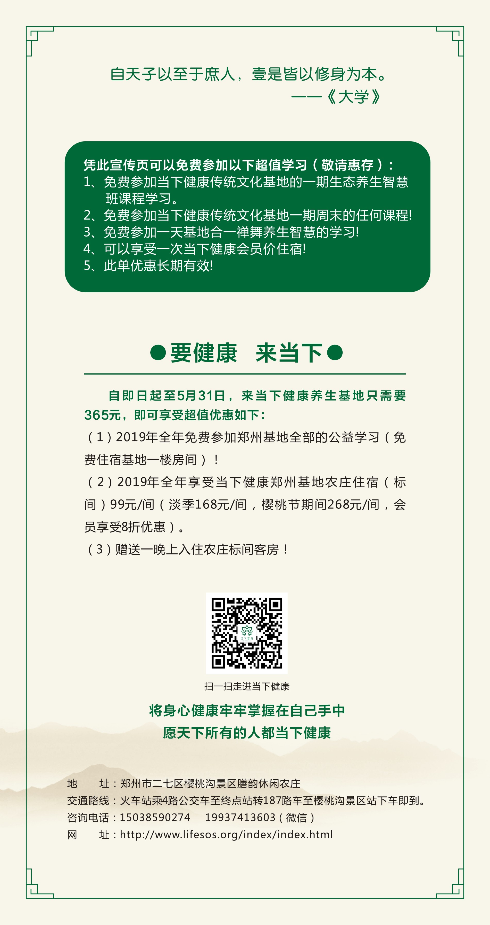 当下健康郑州传统文化践行基地位于——国家AAAA级旅游景区郑州樱桃沟景区膳韵休闲农庄,是一个集中国优秀传统多元文化于一体的文化研究、教育和传播机构。基地占地面积约80亩,主体为三层徽式建筑,建筑面积2000多平。建筑楼内:一楼大厅及住宿,两个休闲大厅。二楼、三楼:会议室及客房。院内:L型环廊餐厅(三个包房,两个餐厅)可容纳二百个餐位,健身活动草地。本基地致力于弘扬、践行中华优秀传统文化的多元教育和传播,中华养生文化、现代心理学及健康生活方式的国学文化的传承和研究。